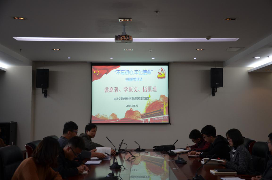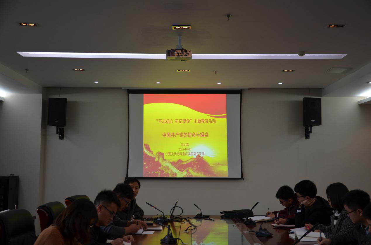 2019年10月23日,中共宁夏光伏材料重点实验室党支部在科技楼A610会议室召开第五次“不忘初心、牢记使命”主题教育,包括非党员在内的全体师生参加。党支部书记何力军同志讲授党课,题为“中国共产党的使命与担当”。