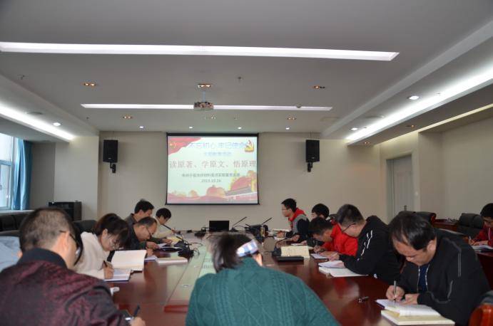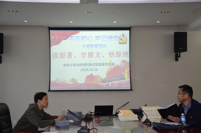 2019年10月16日,中共宁夏光伏材料重点实验室党支部在科技楼A610会议室召开“不忘初心、牢记使命”主题教育,开展“读原著学原文悟原理”专题学习活动第三讲,全体师生党员参加。会议由支部书记何力军同志主持。