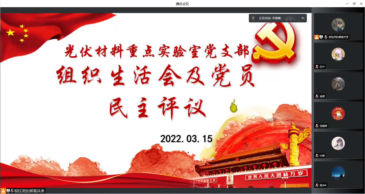 2022年3月15日,宁夏光伏材料重点实验室党支部基于腾讯会议平台在线上召开组织生活会。全体师生党员、积极分子及发展对象共58人参会,会议由党支部组织委员马薇同志主持。