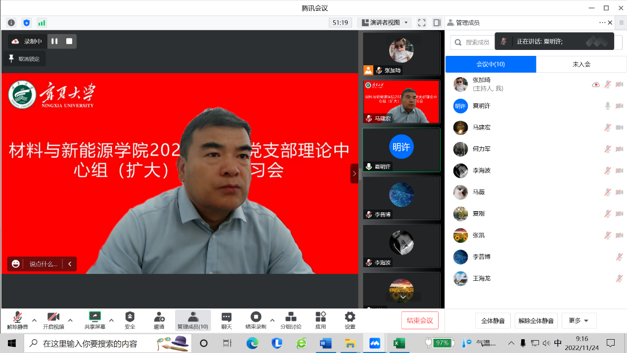 通过线上形式召开2022年直属党支部理论中心组(扩大)第六次学习会,直属党支部书记马建宏主持会议,院长夏明许领学,直属党支部委员、各党小组组长、各办公室负责人参加会议。