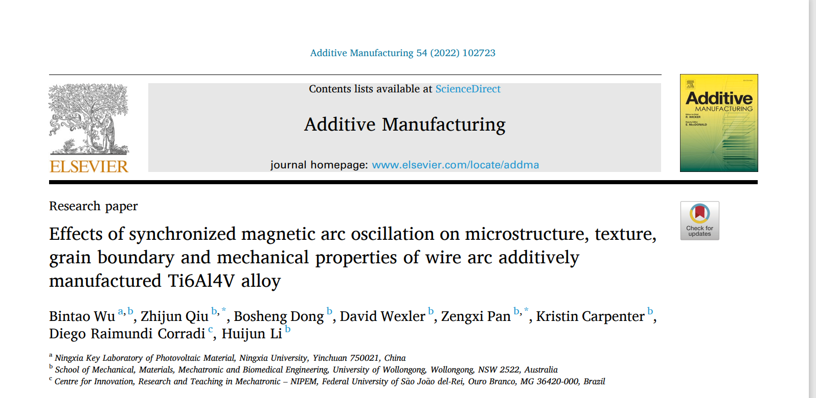 近日,宁夏光伏材料重点实验室吴斌涛副教授团队在电弧熔丝增材制造钛合金研究领域取得重要科研进展,其论文“ Effects of synchronized magnetic arc oscillation on microstructure, texture, grain boundary and mechanical properties of wire arc additively manufactured Ti6Al4V alloy”发表在国际增材制造领域顶刊《Additive Manufacturing》(IF=11.632,中科院一区top期刊)上,论文以宁夏大学为第一单位,吴斌涛副教授为第一作者。