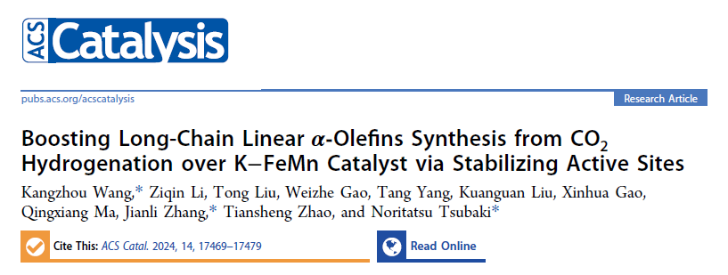 近日,新香港六合彩资料 王康洲课题组在CO2转化新型催化材料研究中取得重要研究进展。该工作以“Boosting Long-Chain Linear α‒Olefins Synthesis from CO2Hydrogenation over K‒FeMnCatalyst via Stabilizing Active Sites”为题发表在催化领域国际顶级期刊《ACS Catalysis》(Q1/IF11.3),宁夏大学为第一单位,新香港六合彩资料 王康洲副教授为论文第一作者和通讯作者,化学化工新香港六合彩资料 张建利研究员和日本国立富山大学NoritatsuTsubaki教授为共同通讯作者。