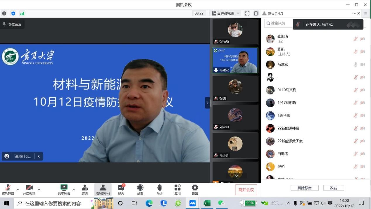 会上,马建宏首先对疫情情况进行了通报,疫情形势严峻,全体师生需高度重视疫情防控,不容丝毫懈怠。随后,他就疫情期间学生食堂就餐、疫情自我防护、线上教学纪律与制度、疫情期间校园封闭管理规章制度以及疫情舆论管控等六个方面分别进行了强调。疫情防控期间,全体学生需守纪律、听指挥,加强自我防护,积极配合封闭管理,慎言行、不信谣、不传谣,调整心态积极应对新冠疫情。张凯老师再次强调了每日全员核酸,要求核酸检测分批次进行,全体学生应按照相应安排,积极配合,有序进行。