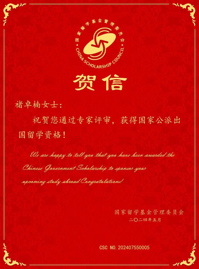 2022级硕士研究生褚卓楠同学,获批“2024年国家留学基金资助出国留学人员”资格,赴澳大利亚伍伦贡大学(University ofWollongong)攻读博士学位研究生。这是新香港六合彩开奖