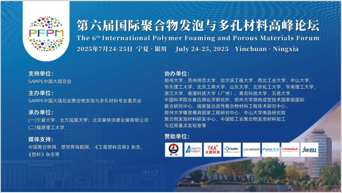 7月24-25日,由SAMPE中国大陆总会聚合物发泡与多孔材料专业委员会(专委会)主办,宁夏大学、北方民族大学、福建理工大学及北京莱特沃德会展有限公司联合承办的第六届国际聚合物发泡与多孔材料高峰论坛(PFPM)在银川成功举办。论坛采用“线下+线上”融合模式,吸引近300名行业精英参会,搭建起跨越地域的学术交流桥梁。宁夏大学副校长冯秀芳、SAMPE全球总会理事长邱夷平、专委会主任赵玲教授出席开幕式并致辞。开幕式后,学术报告精彩上演,78篇高质量口头报告呈现了聚合物发泡与多孔材料领域前沿成果。