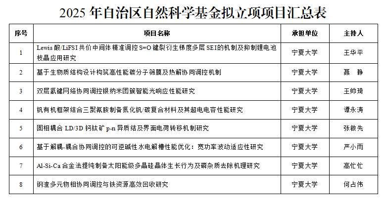 近日,宁夏回族自治区科学技术厅公示了2025年度自治区自然科学基金项目评审结果,新香港六合彩开奖 成功获批8项,在此,向立项的各位教师表示祝贺!