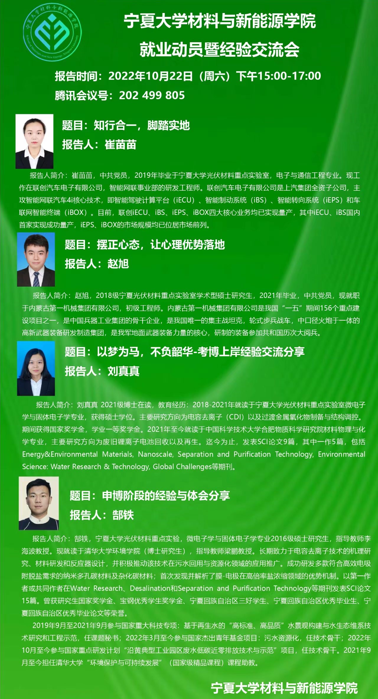 会上,首先由优秀毕业生代表作就业经验分享。郜铁与刘真真主要就考取博士研究生的院校选取、考核申报流程以及技巧与注意事项做了详细介绍;赵旭与崔苗苗两人主要就入职就业的个人选择、定位以及规划做了相关经验的分享。四人的分享,系统全面、深入浅出,具有很好的借鉴意义。