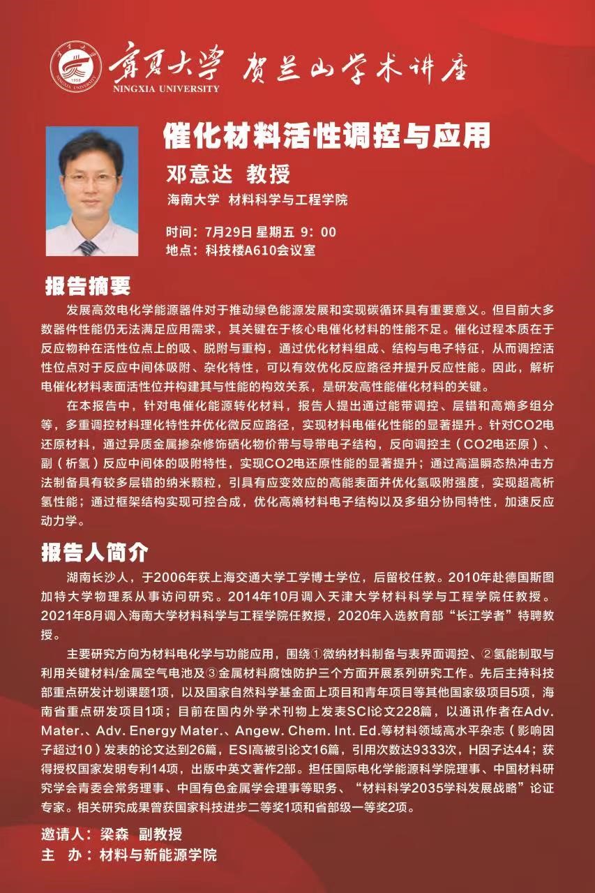 邓意达教授在贺兰山校区科技楼A610会议室作了题为“催化材料活性调控与应用”的学术报告。报告会由副院长李海波同志主持,新香港六合彩资料