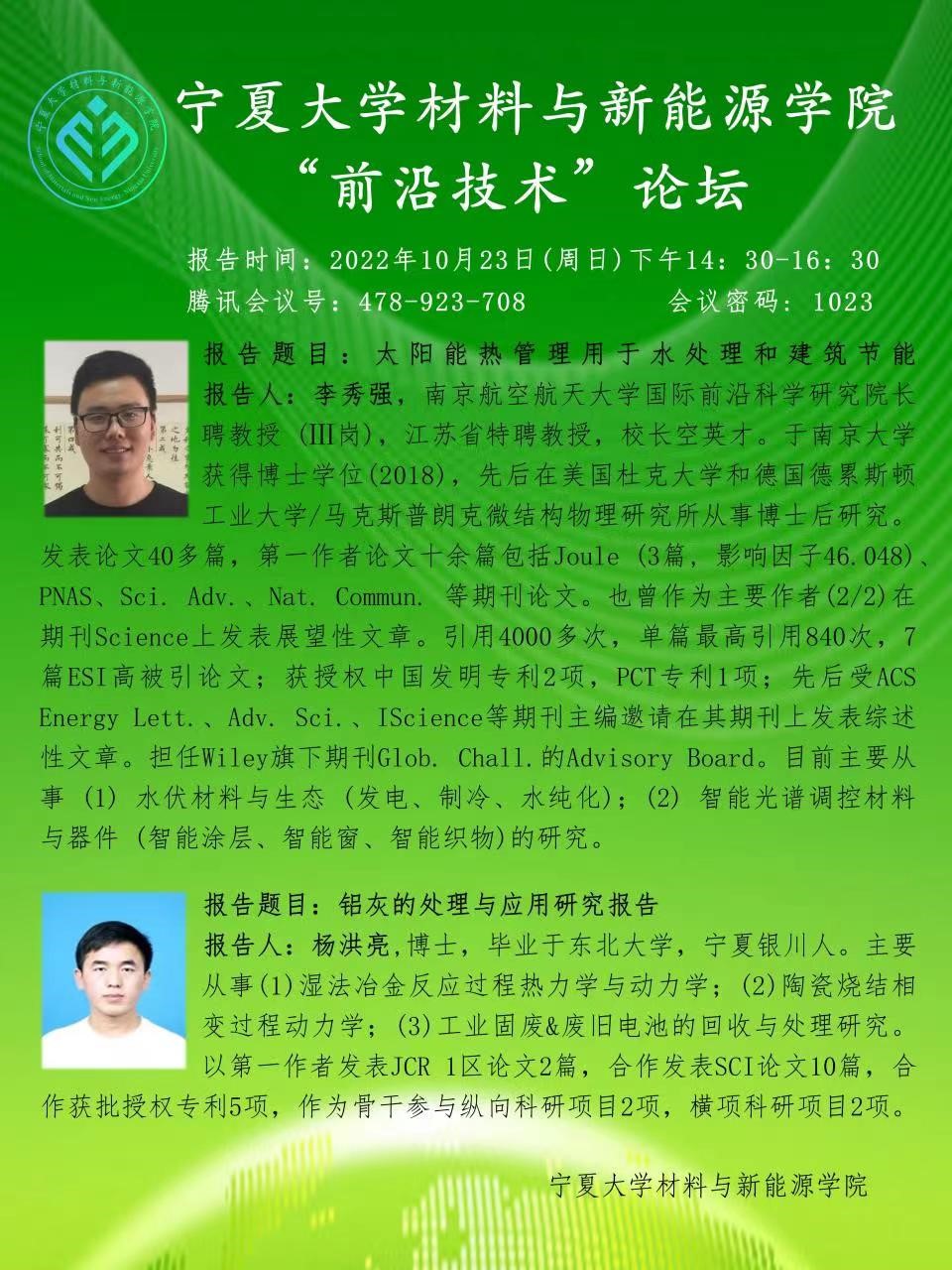 通过线上形式举办“前沿技术”论坛,论坛由李海波副院长主持,南京航空航天大学国际前沿科学研究院李秀强教授和东北大学杨洪亮博士分别作了题为“太阳能热管理用于水处理和建筑节能”和“铝灰的处理与应用研究”的主题报告,新香港六合彩资料