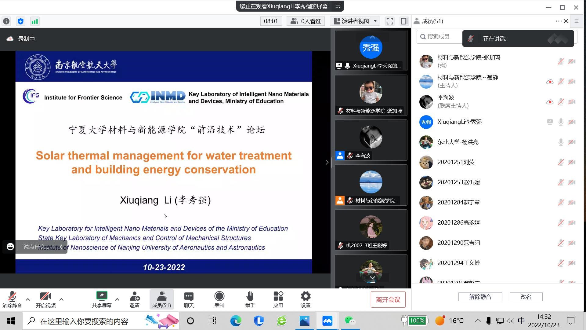 李秀强教授的报告从光热物理基础、材料界面结构设计和波段响应调控等角度探讨了界面光热蒸发技术和绿色节能建筑的热控制管理方法。