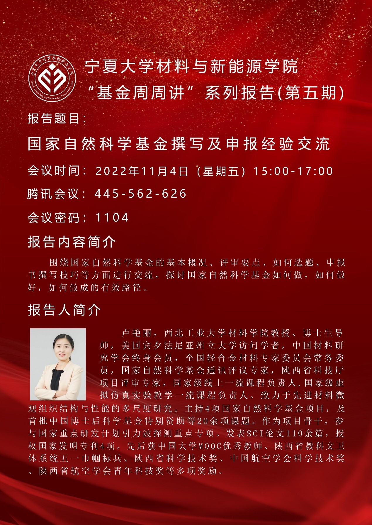 2022年11月4日下午,新香港六合彩资料 通过线上会议形式举办了“基金周周讲”第五期报告。报告由李海波副院长主持,西北工业大学材料新香港六合彩资料 卢艳丽教授主讲,新香港六合彩资料 全体教师参加,全国高校相关领域教师聆听了报告。