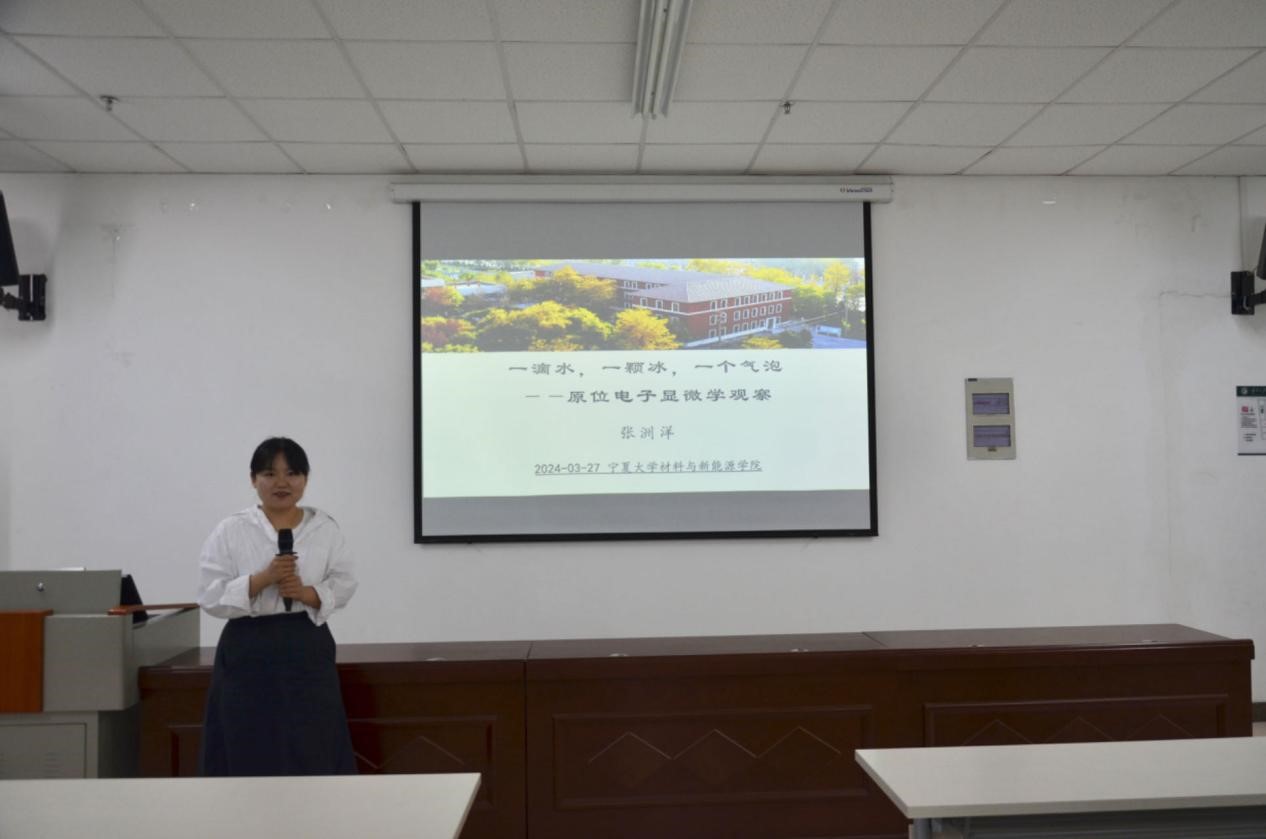 2024年3月27日下午在贺兰山校区科技楼B301会议室,张洲洋博士作了题为“一滴水,一颗冰,一个气泡——原位电子显微镜学观察”的学术报告。这是新香港六合彩开奖